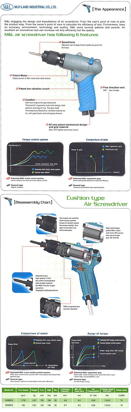 Founded in 1976, the main products M&L supplies are Pistol and straight type, shut-off, cushion, direct, and positive Air Screwdriver, drill and wrench. We have the advanced and excellent production equipments and technologies in producing, as our hot products, Air Screwdriver, Air Drill, Electric Screwdriver, Pneumatic Screwdriver, and Air Die Grinder. M&L provides patented clutch with 3% deviation of torque and longer life cycle of motor. Our color torque system gives users an easily visible torque marking system at a glance for all R-series tools to make the users choosing the color for each torque level on assembly line. As one of the professional and well-known Hand Tools supplier, M&L owns a completed production line as assembly, packing, sales, repair with our excellent R&D Department. We only provide our clients the best and quality products and services. Contact Us Now! We are ready to fill all of your volume orders! To find more products detailed information, please click here to our showroom or Contact Us Now for further products information. Our know-how will answer to all your needs!