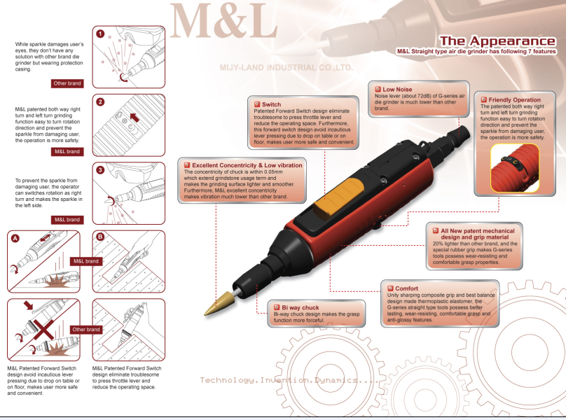 1. High quality Oil-free Motor ML high quality Oil-free Motor is our new design used on high technologic tool. At the beginning operation, the power of Oil-free motor keeps stable at it?s top apability without any oil injection, but the power of Current motor decreases till it?s lowest capability after 32 hours operating unless oil adding. The high technologic Oil-free motor with 70dB noise prevents operator and environment from noise damaging and accords with industrial classified tool standard.