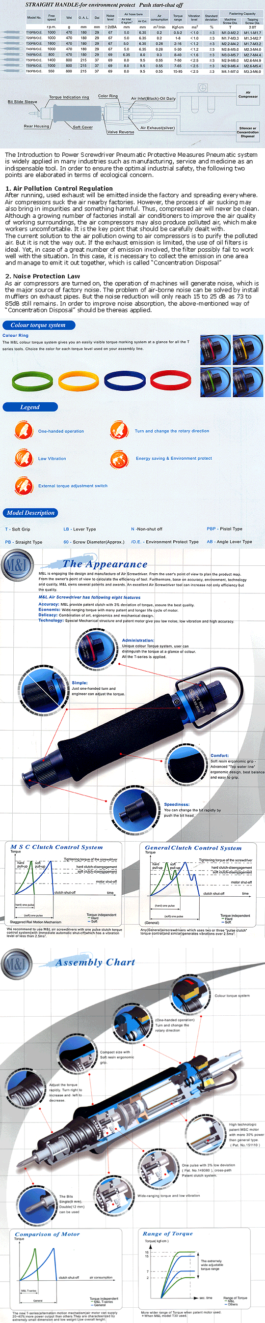 1. Standard: . 1/8 inch PT screw in silencer can be removed to allow exhaust air to be piped away. 2. Capability: . Greater Comfort for the Operator (Ergonomic and Soft Grip): the new T series are characterized by extremely small dimensions, low weights and short overall lengths. . Easy adjusting fastening torque by tightening or loosening nut torque indication . Tighten to the Right: increase torque . Loosen to the Left: decrease torque . Low Standard Deviation: all controlled drivers assemble and control the operation at the same time. They guarantee the highest torque accuracy (+/- 3% standard deviation). . Easy change of valve reverse (right/left) button turn direction can be done. . Large Torque Range and Low Vibration Level: the new stagger rail motion mechanism allows obtaining the low vibration level and large torque range. . More Power: the new alternation motion mechanism obtains more power.